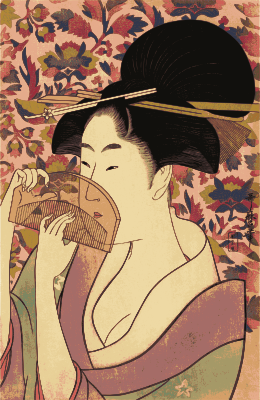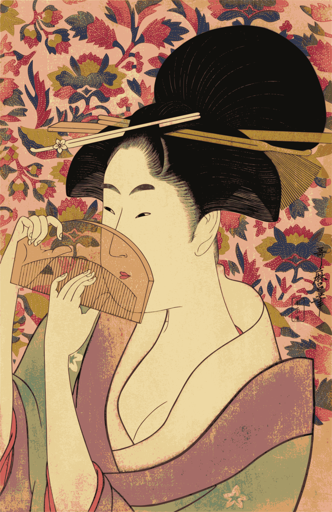- beautiful chest cleavage comb culture girl Japan Japanese kimono lady print Semi-Realistic People sensual woman woodblock shy flirt