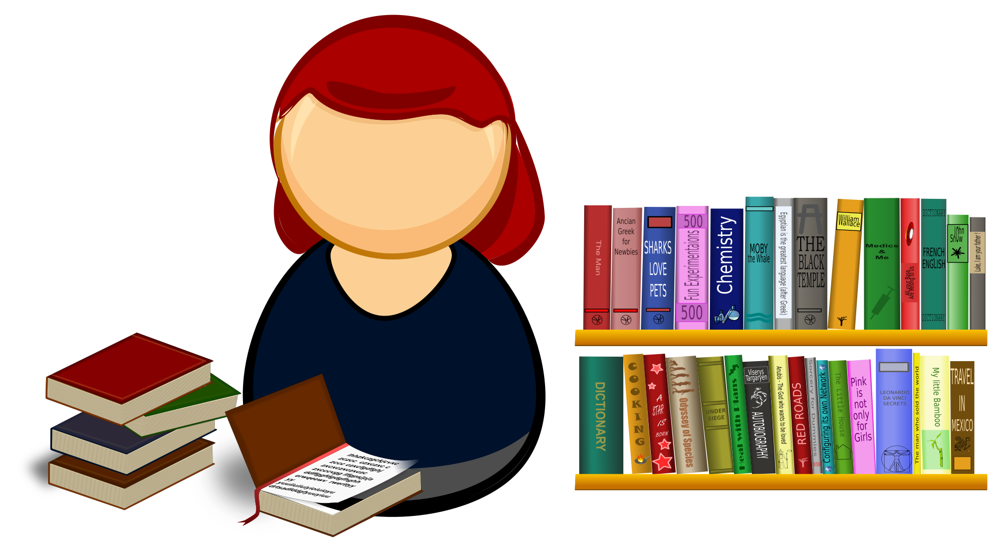Simplified icon of a female librarian with booksPS: if someone creates a nice colored orang-utan then next remix could be the Librarian from Discworld :-)