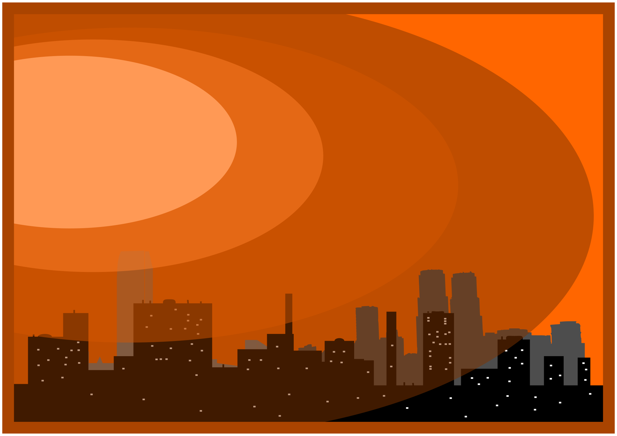 Città al tramonto con foschia. Sunset city with mist.