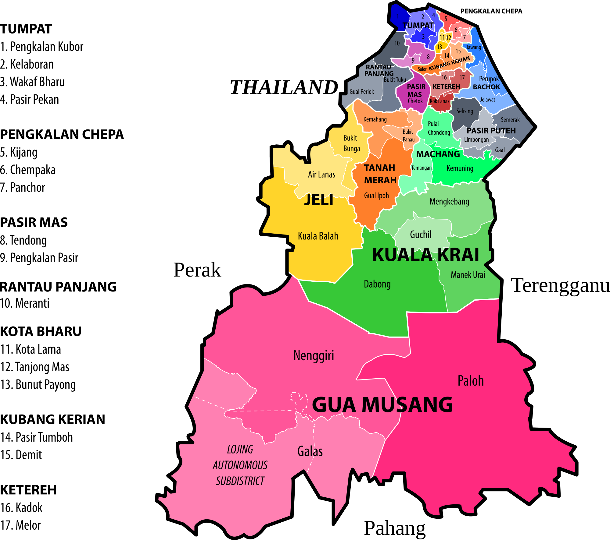 Map of the constituencies of the Kelantan State Legislative Assembly (Dewan Undangan Negeri Kelantan) with 2013 election borders. Fine-tuned the borders