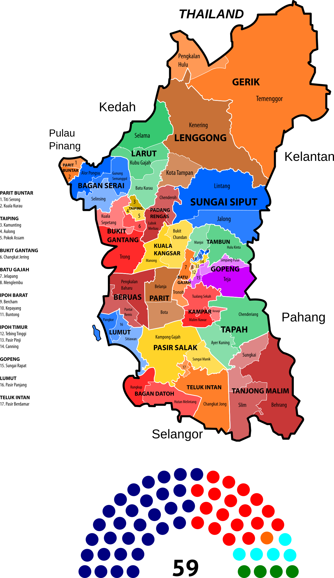Map of the constituencies of the Perak State Legislative Assembly (Dewan Undangan Negeri Perak) as of 2015 with fine-tuned borders and number of seats