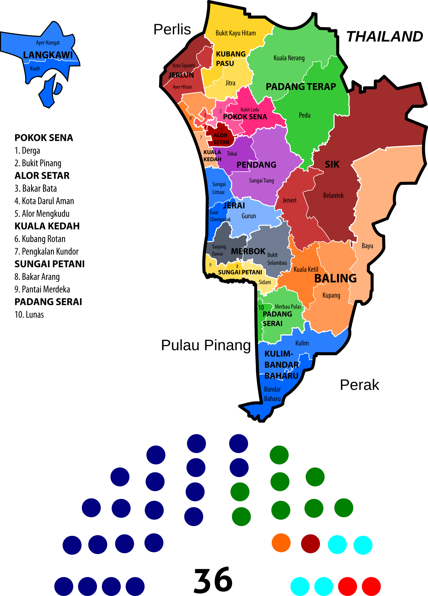 Map of the constituencies of the Kedah State Legislative Assembly (Dewan Undangan Negeri Kedah) as of 2015. Fine-tuned borders and added seat composition.
