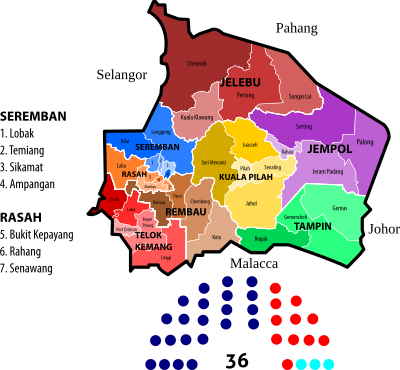 Map of the constituencies of the Negeri Sembilan State Legislative Assembly (Dewan Undangan Negeri Negeri Sembilan) as of 2015. Fine-tuned borders and added seat composition