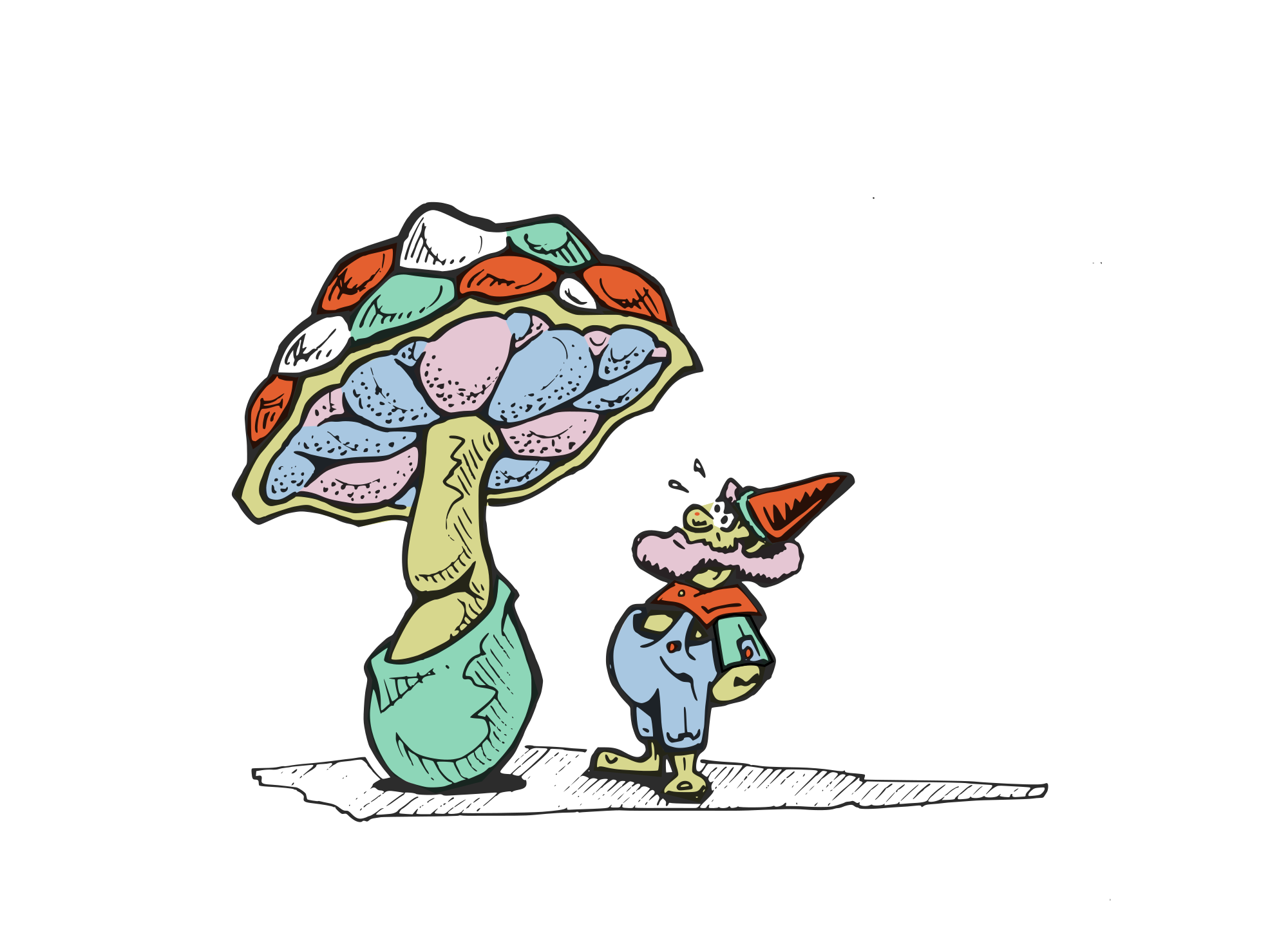 A doodle of a little fairy dwarf looking at a mushroom