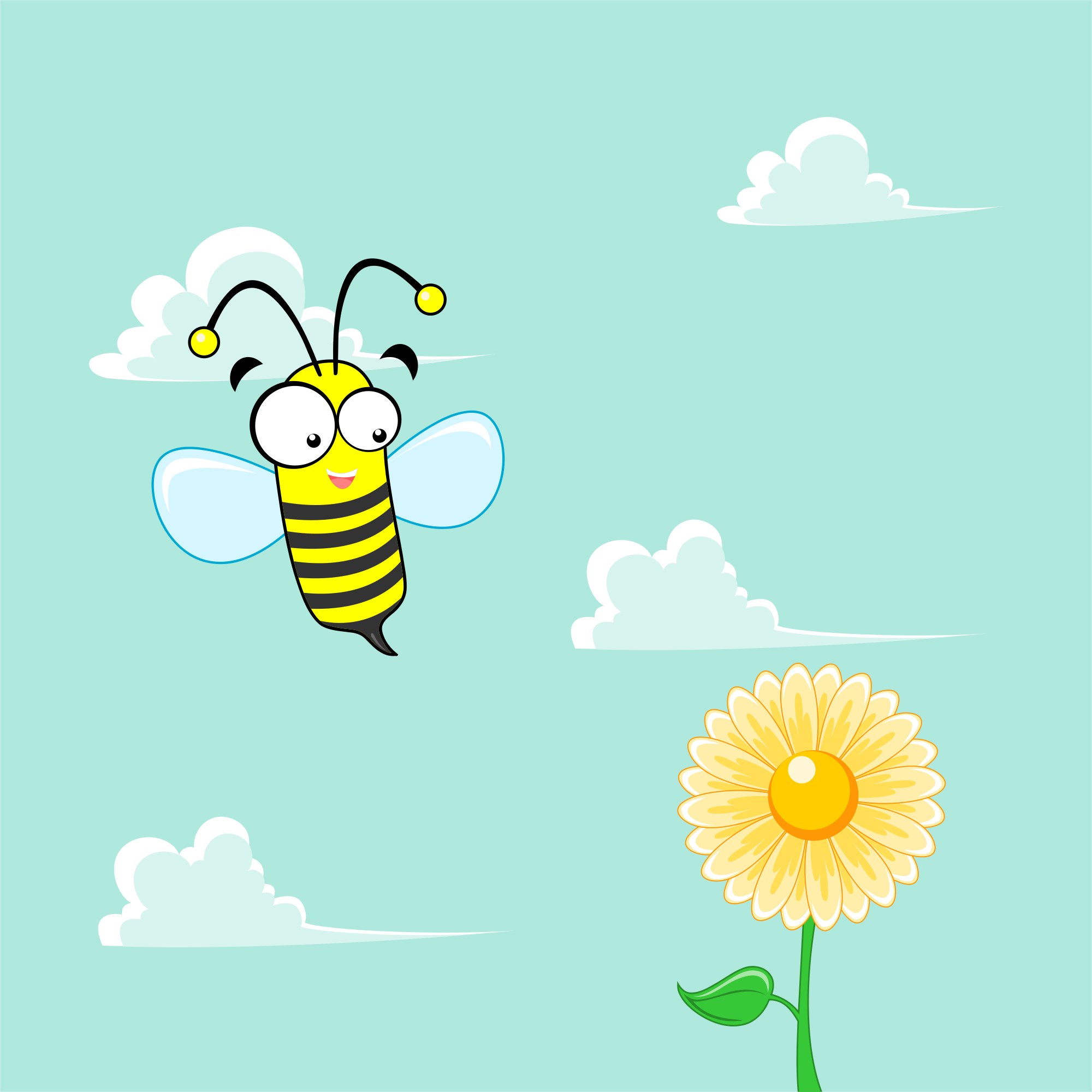 maskot lebah sedang terbang mengelilingi bunga yang mekar