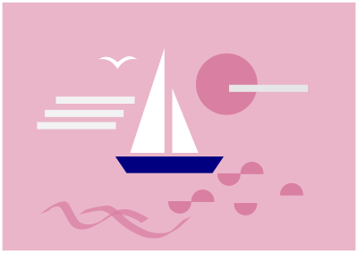 Piccola barca rosa che veleggia al tramonto.