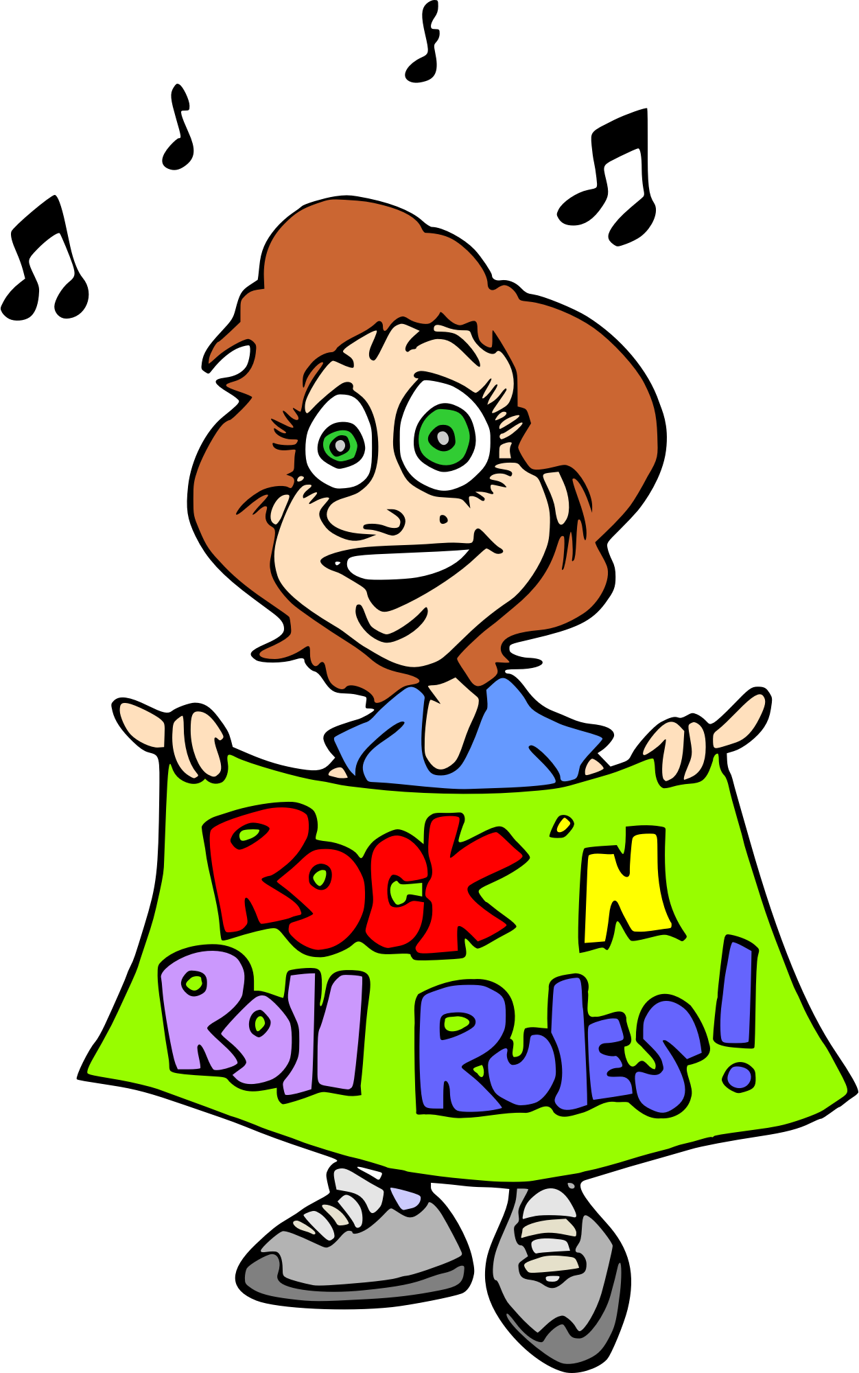 - girl young female teenager fan music notes rock roll pop popular sign rules standing smiling cartoon comic happy smile