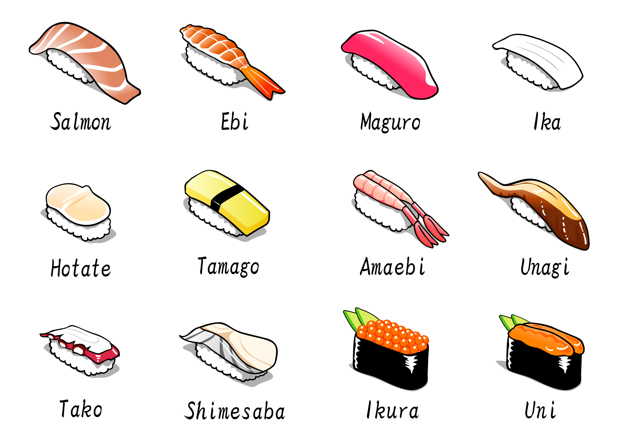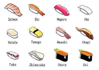 Various types of nigiri sushi. This image was adapted from a picture posted to gahag.net. All of the images on this site are in the public domain i.e. CC0. This site is only in Japanese but can be easily navigated with Google Translate.