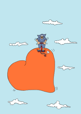A page filling cartoon of a catholic nun filling a heart shaped balloon with air, floating in a blue sky with white clouds.
