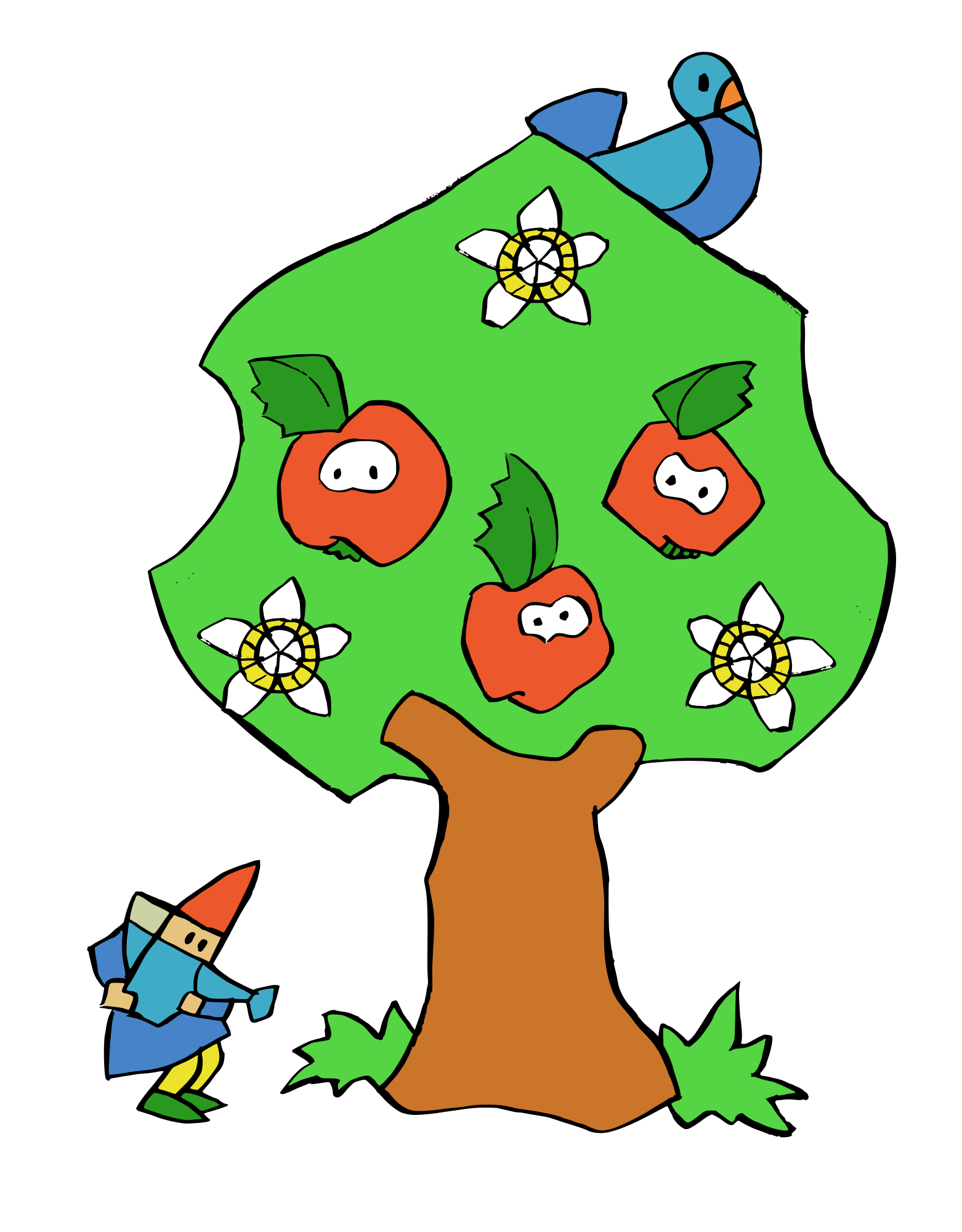 A gnome watering an apple tree with three appels, blossoms and one dove in it.