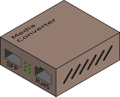 Shows a Media Converter, used connect fiber to copper cables.