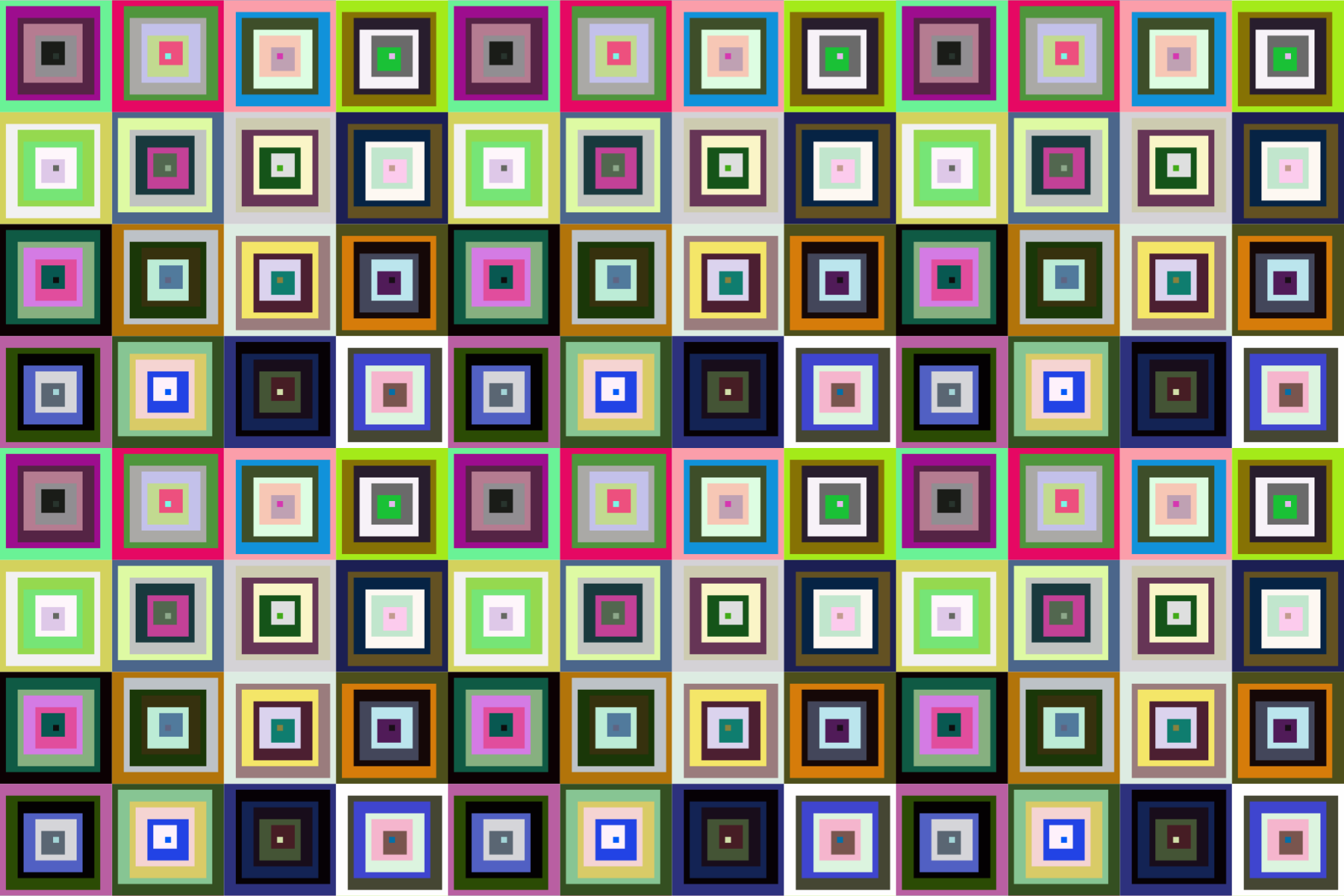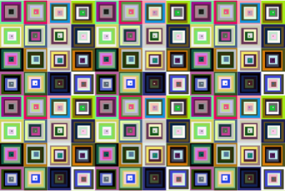 A seamless pattern formed from a square tile. The tile can be retrieved by selecting the rectangle in Inkscape and using shift-alt-I. A version of the original with random colours