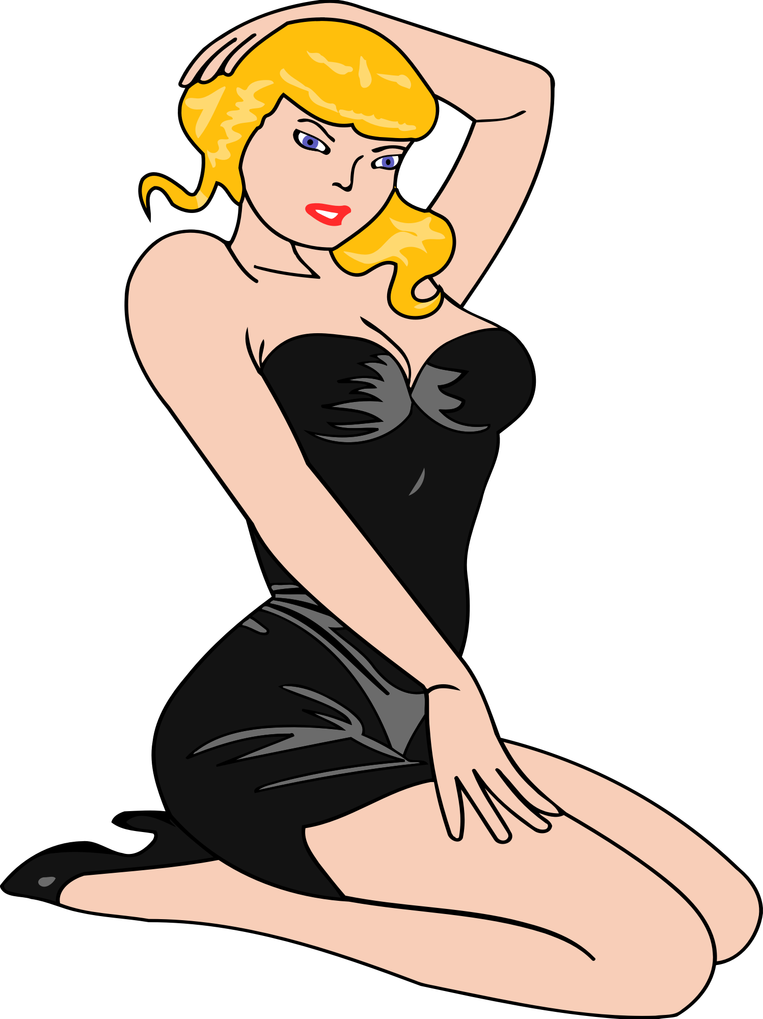 Woman kneeling (light skin, black dress, red hair)