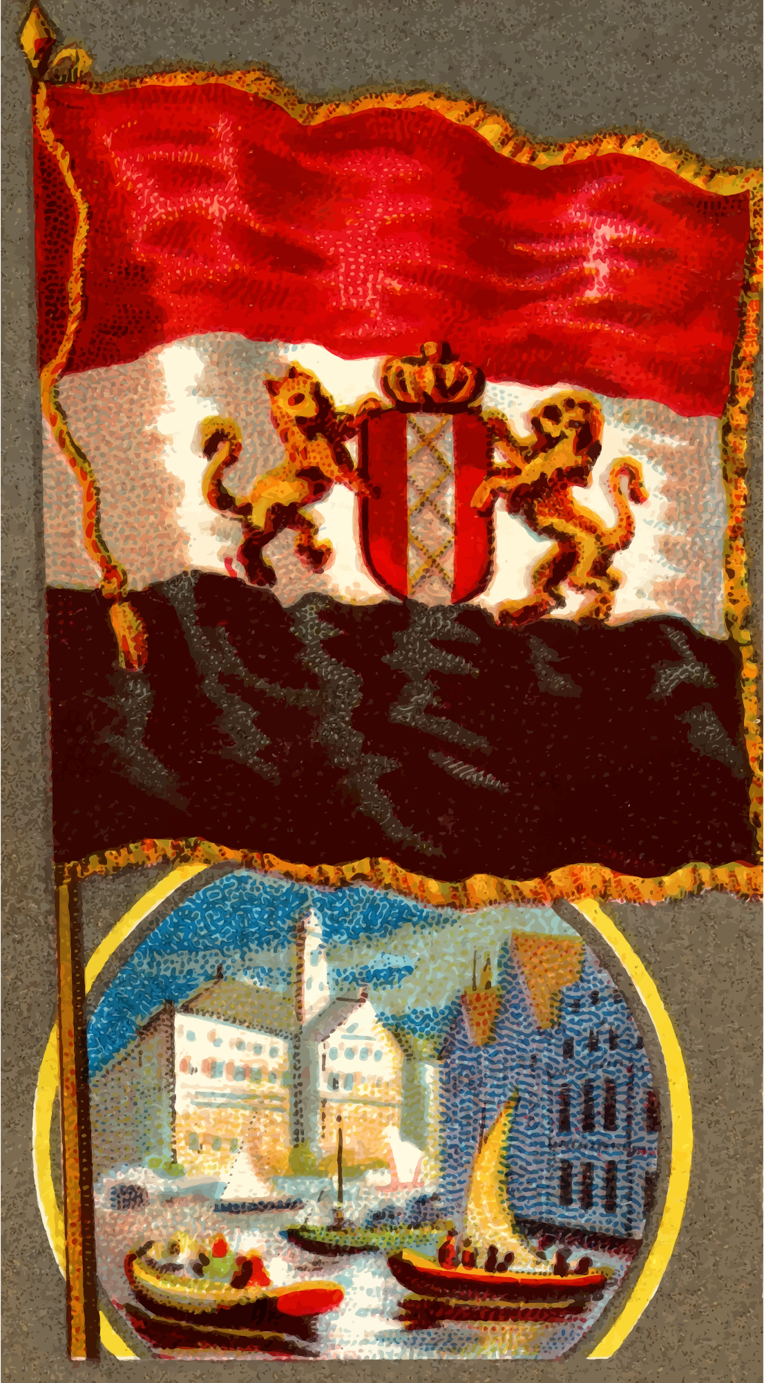 One of the "City Flags" series of cigarette cards from Allen & Ginter, 1887. I'm uploading all 50 of them over the next few weeks. Due to their age I have done a little restoration where needed and also cropped them to just the picture, adjusted contrast, brightness and colour saturation. The originals can be found on the New York Metropolitan Museum of Art web site.
