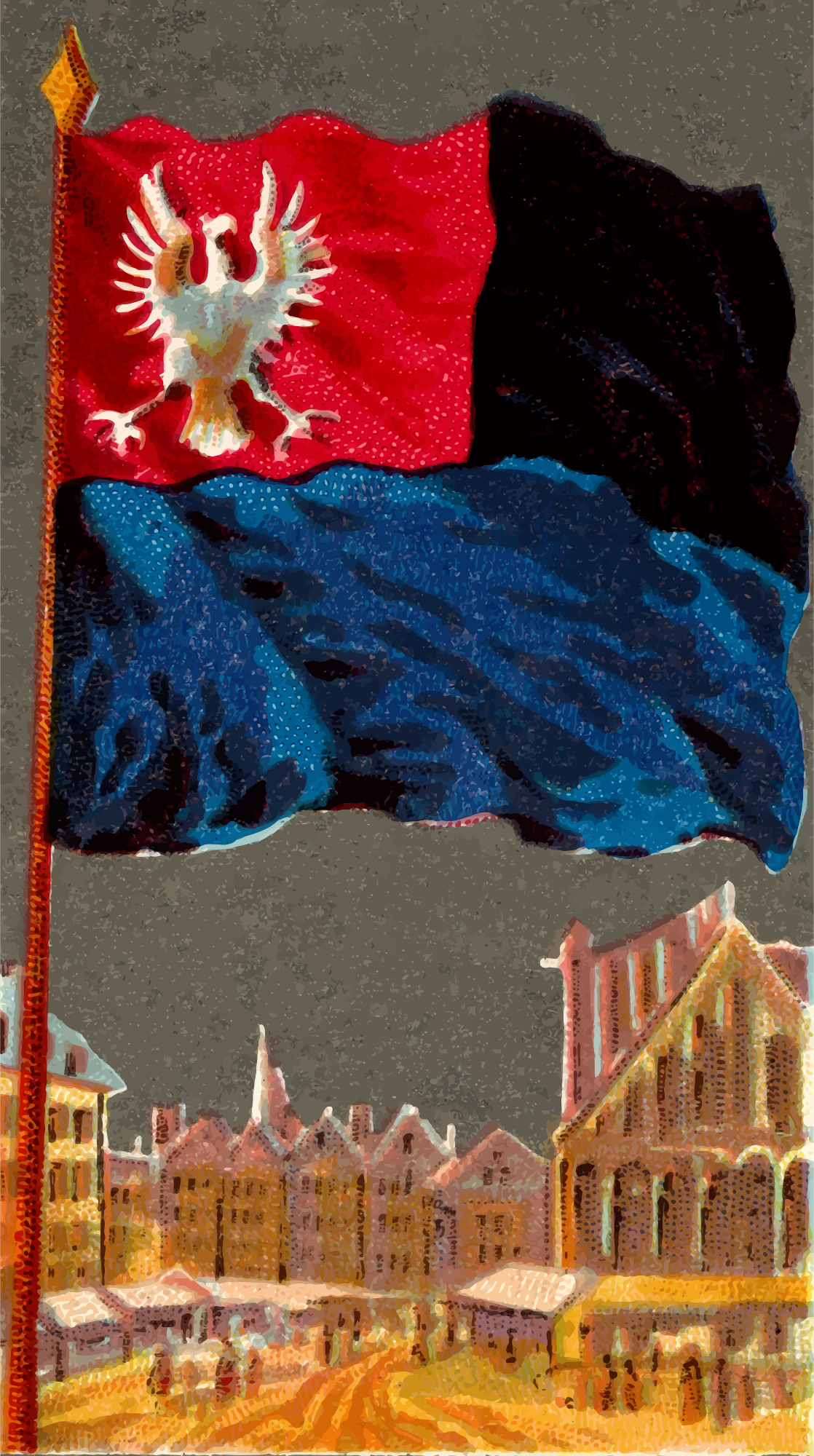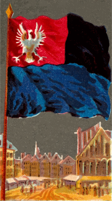 One of the "City Flags" series of cigarette cards from Allen & Ginter, 1887. I'm uploading all 50 of them over the next few weeks. Due to their age I have done a little restoration where needed and also cropped them to just the picture, adjusted contrast, brightness and colour saturation. The originals can be found on the New York Metropolitan Museum of Art web site.