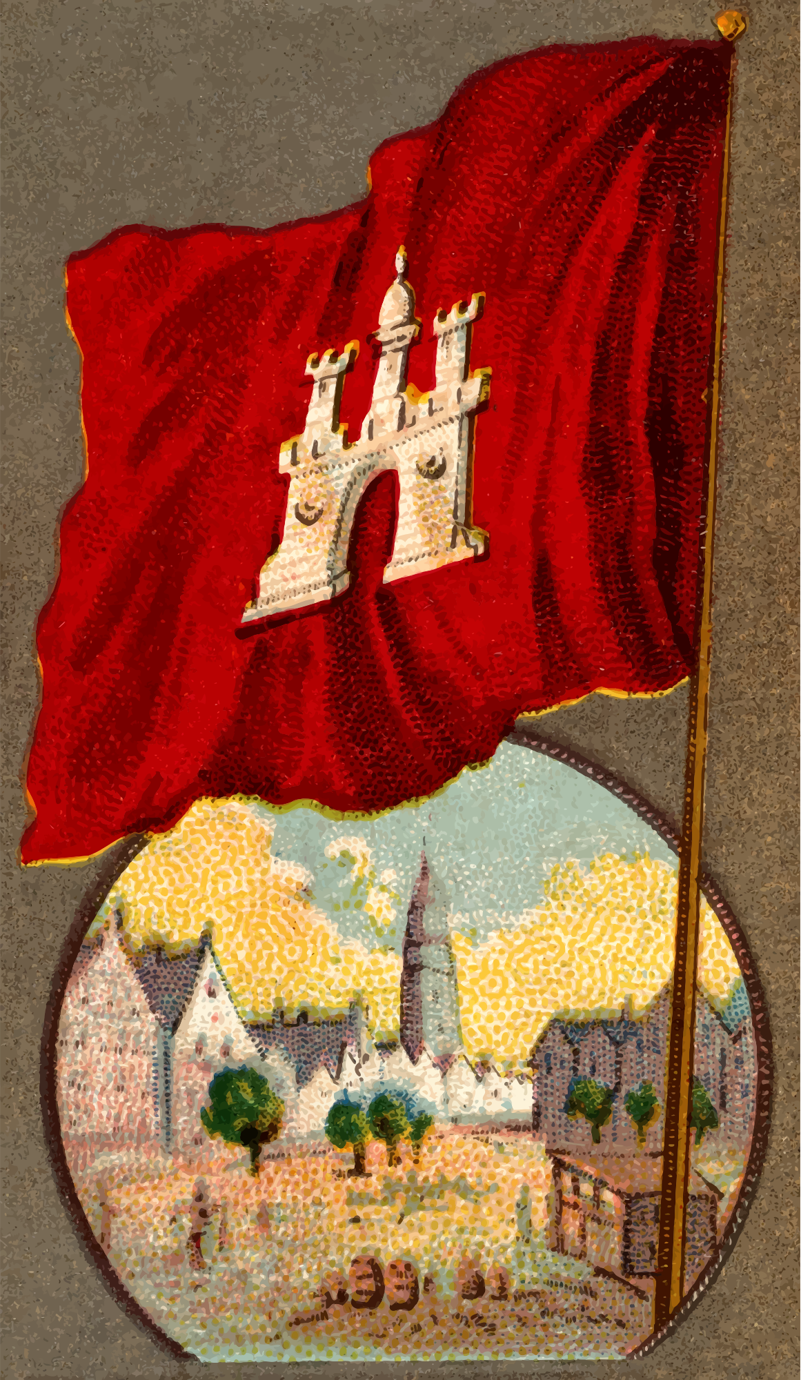 One of the "City Flags" series of cigarette cards from Allen & Ginter, 1887. I'm uploading all 50 of them over the next few weeks. Due to their age I have done a little restoration where needed and also cropped them to just the picture, adjusted contrast, brightness and colour saturation. The originals can be found on the New York Metropolitan Museum of Art web site.