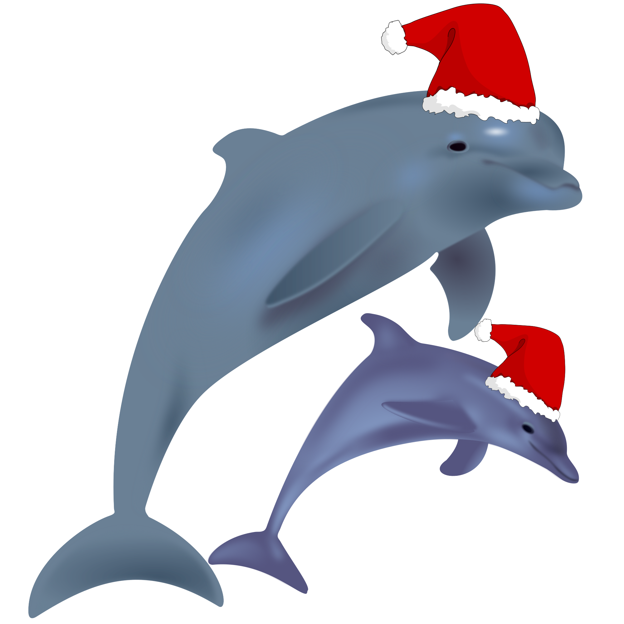 Two different dolphins wearing Christmas hats.