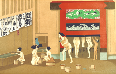 From a drawing in 'Sketches of Japanese Manners and Customs', Jacob Silver, 1867. Bath house.