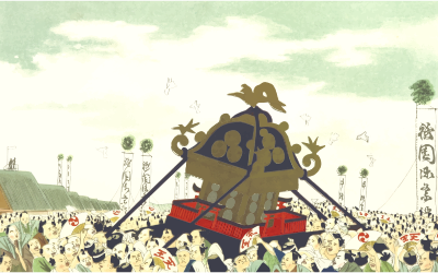 - chromolithograph chromolithography comic comical divinity festival Japan Japanese Otinta Sama print scene Semi-Realistic People temple Shinto shrine mikoshi