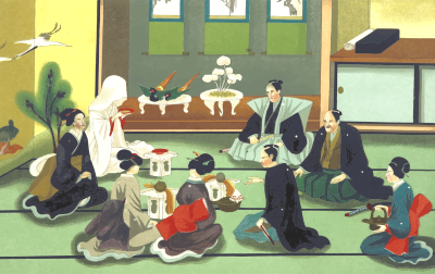 From a drawing in 'Sketches of Japanese Manners and Customs', Jacob Silver, 1867. A Japanese wedding.