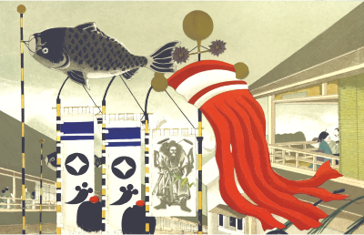- Japan Japanese scene print chromolithograph chromolithography birth child children celebration festival koinobori