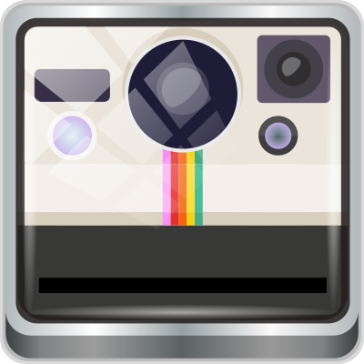 a metallic button or icon for an old instant camera, seen from the front
