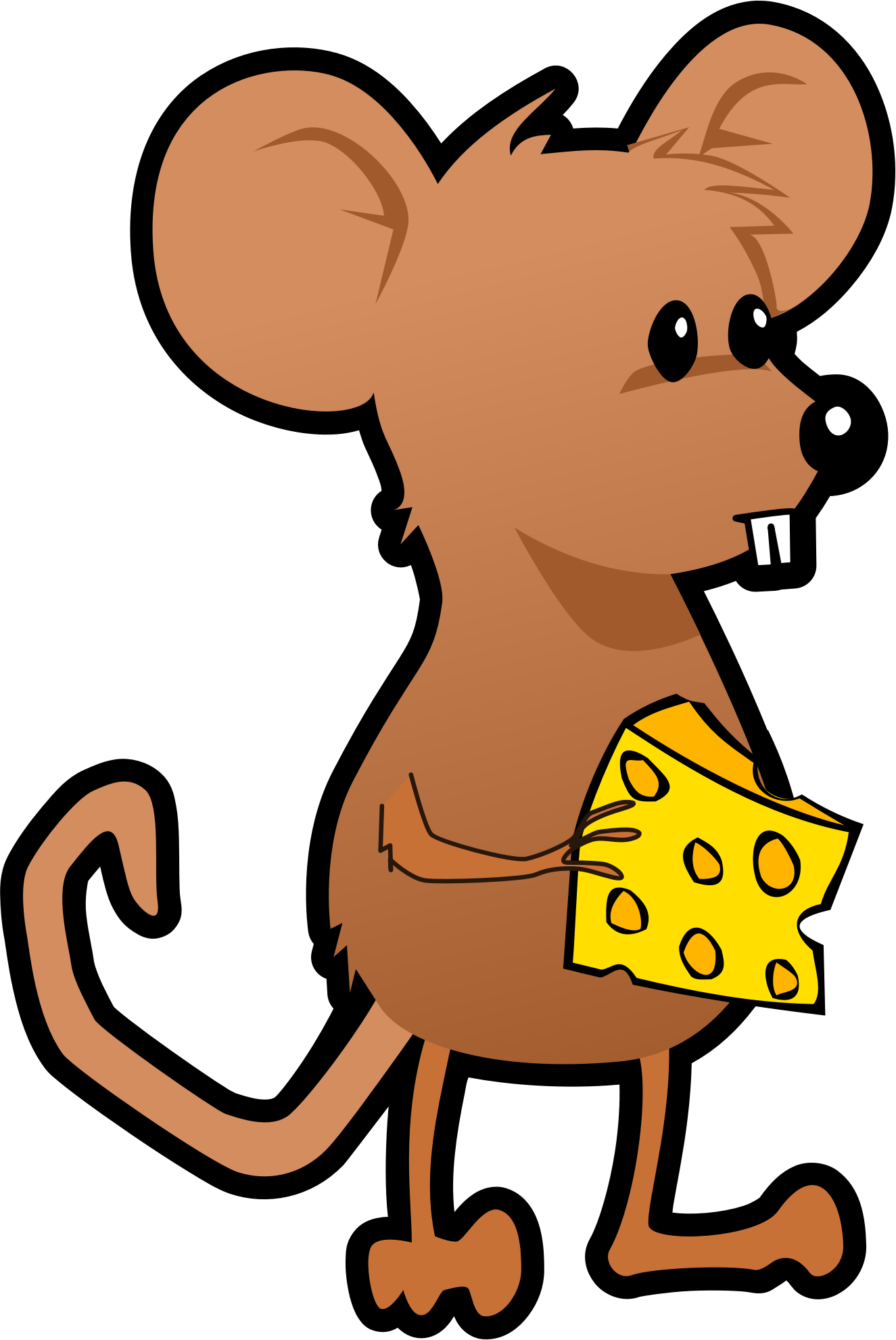 Mouse holding cheese standing up cartoon style.