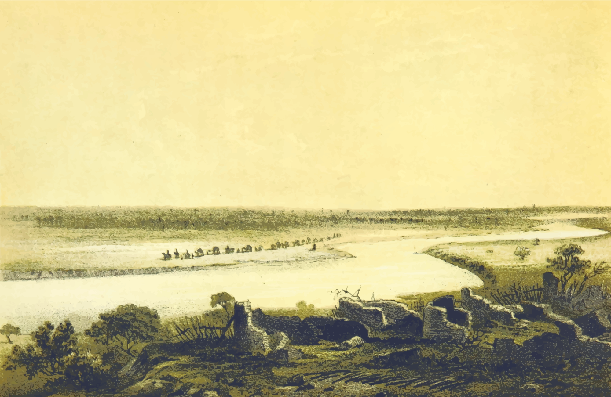 From a drawing in 'Travels and Discoveries in North and Central Africa: being a journal of an expedition undertaken under the auspices of H.B.M.'s Government, in the years 1849-55', Heinrich Barth, 1857. This 5-volume set had around 50 colour plates featuring African scenes. I mean to upload vector versions of all of them over the next few days.