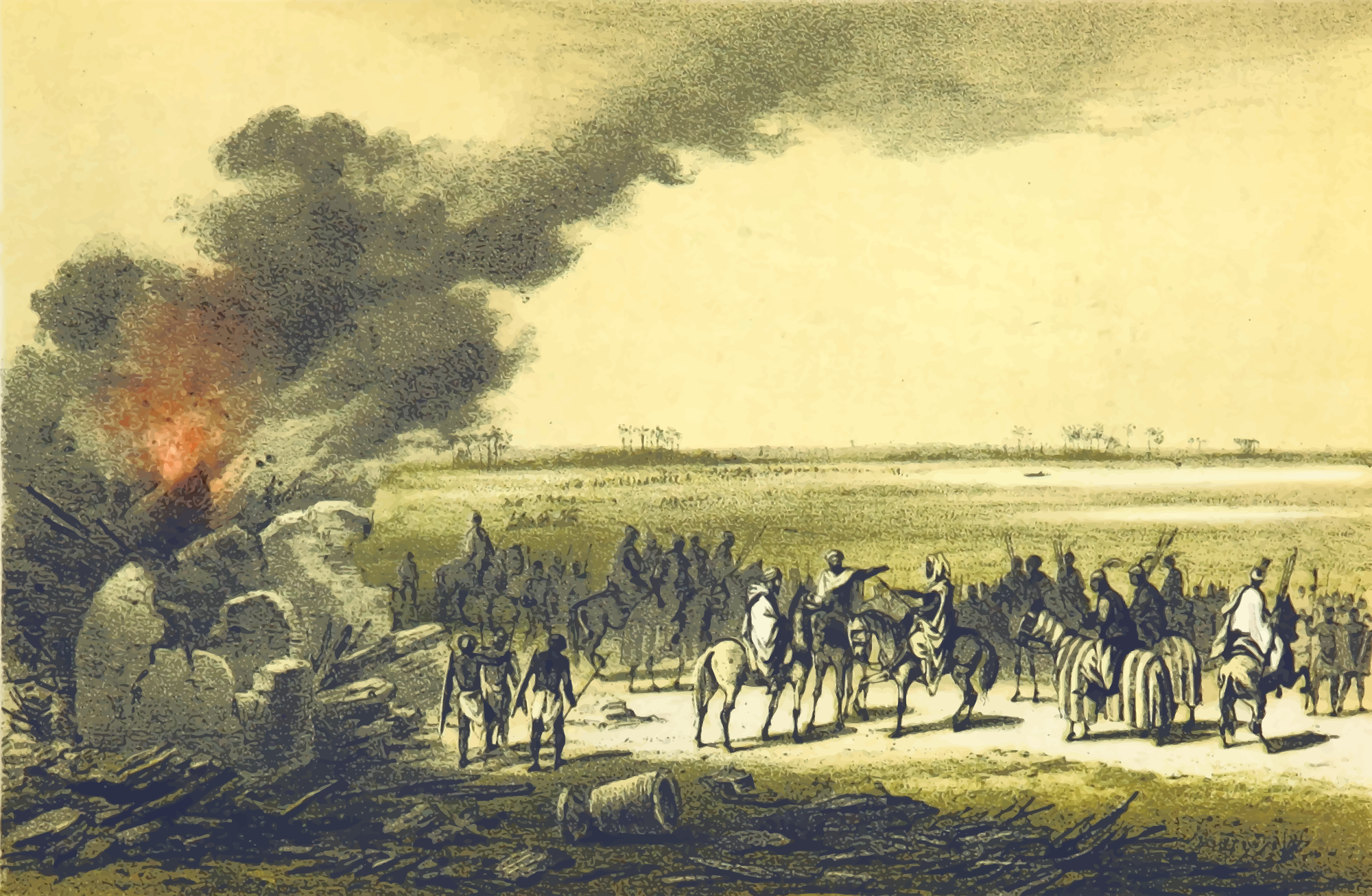 From a drawing in 'Travels and Discoveries in North and Central Africa: being a journal of an expedition undertaken under the auspices of H.B.M.'s Government, in the years 1849-55', Heinrich Barth, 1857. This 5-volume set had around 50 colour plates featuring African scenes. I mean to upload vector versions of all of them over the next few days.
