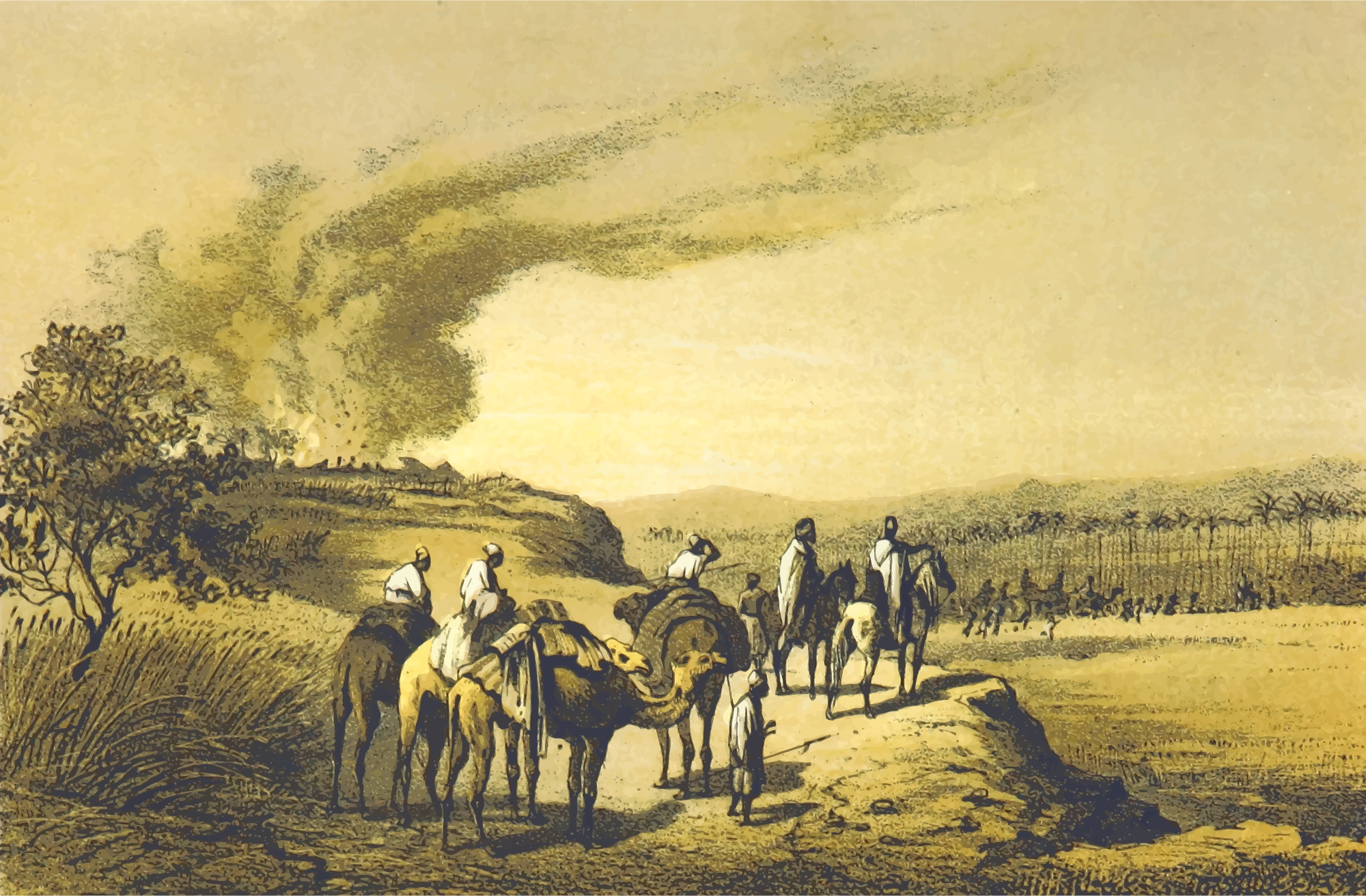 From a drawing in 'Travels and Discoveries in North and Central Africa: being a journal of an expedition undertaken under the auspices of H.B.M.'s Government, in the years 1849-55', Heinrich Barth, 1857. This 5-volume set had around 50 colour plates featuring African scenes. I mean to upload vector versions of all of them over the next few days.