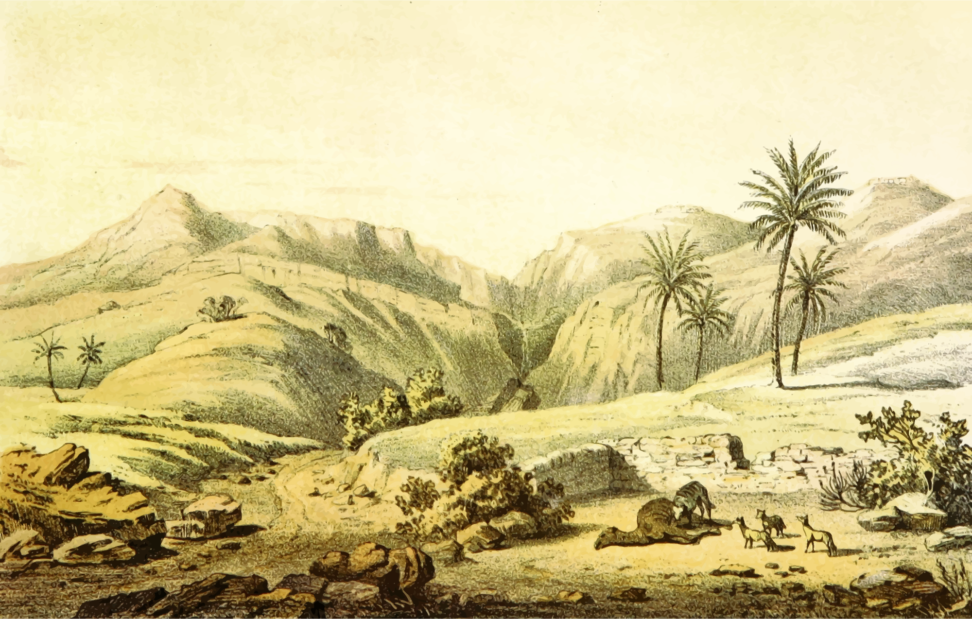 From a drawing in 'Travels and Discoveries in North and Central Africa: being a journal of an expedition undertaken under the auspices of H.B.M.'s Government, in the years 1849-55', Heinrich Barth, 1857. This 5-volume set had around 50 colour plates featuring African scenes. I mean to upload vector versions of all of them over the next few days.