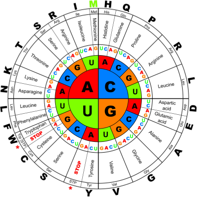 How to read the genetic code: start from the center circle and go outwards. So, if the gene has an AGC, that means amino acid serine. A CGA means arginine. And three of the combinations are stop codons, which don't give any amino acid: UAA, UAG, and UGA.