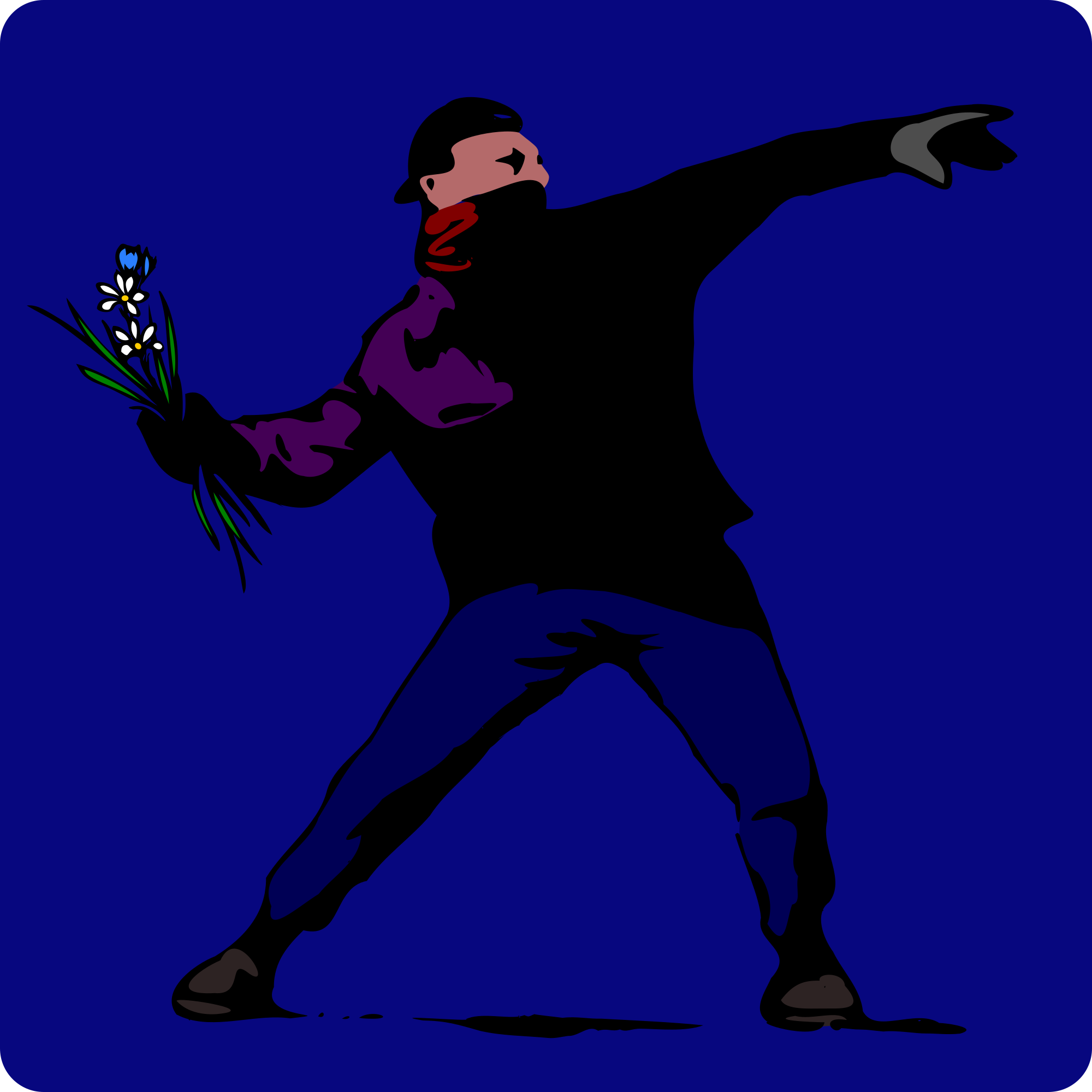 A person with the face hidden behind a scarf throwing some flowers like people would expect someone would throw a stone or a molotov cocktail.