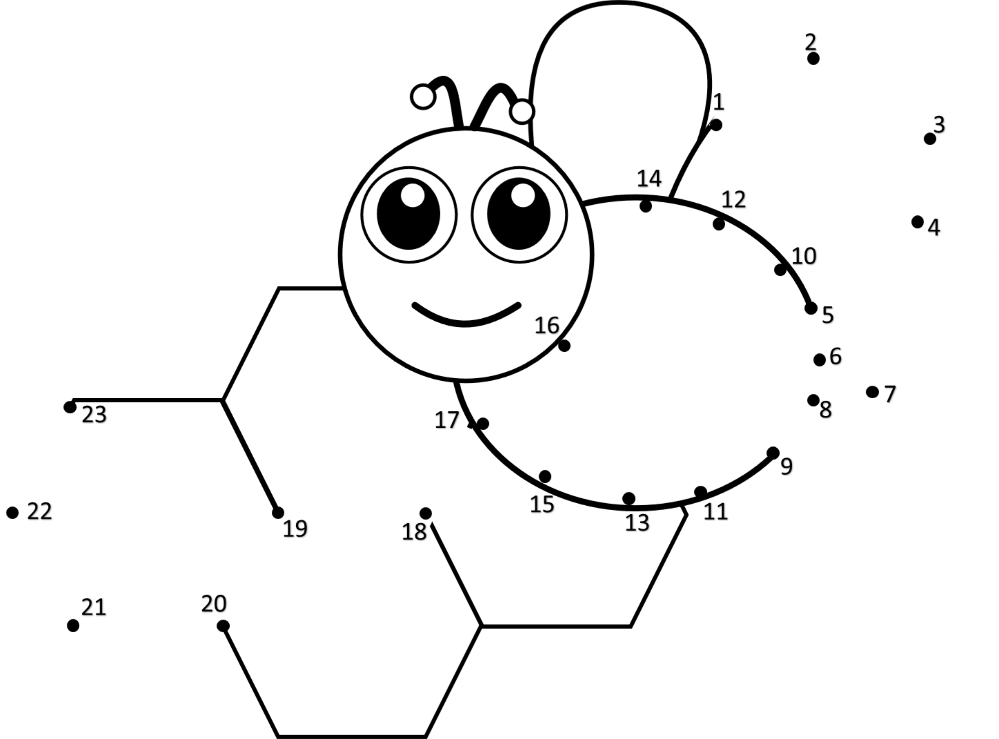 A connect-the-dots drawing of a honeybee flying in front of a honeycomb.