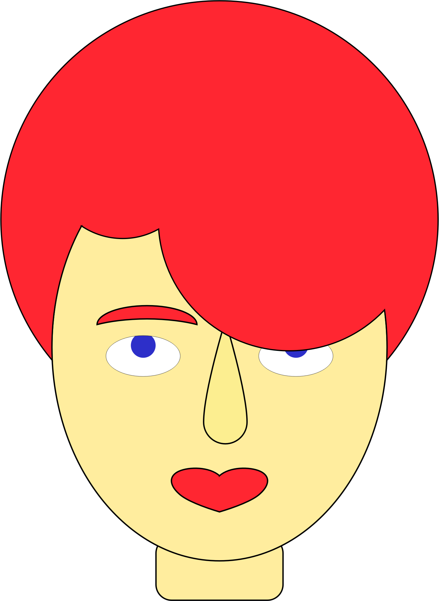 A drawing of a kid with red hair constructed entirely from basic shapes offered in Affinity Designer, namely circle, ellipse, drop, heart, crescent, and rounded rectangle.