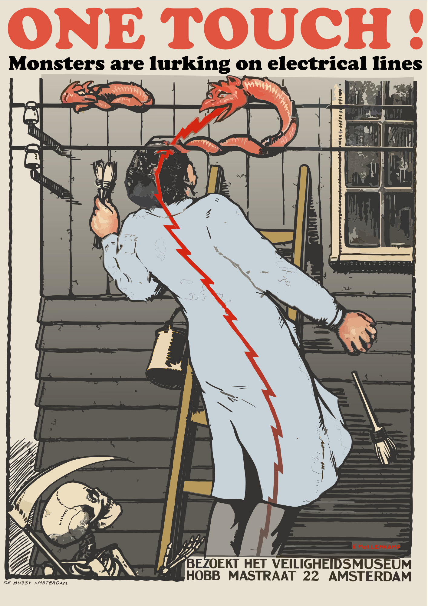- Safety electricity ladder vectorized poster Artist Evert Möllencamp 1925. Dutch Veiligheid death stroke fall