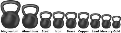 An illustration of the density of some familiar metals. The size of the kettlebells is in inverse proportion to the density of the metals, i.e. the relative sizes are as they would be if the masses of the kettlebells were equal.