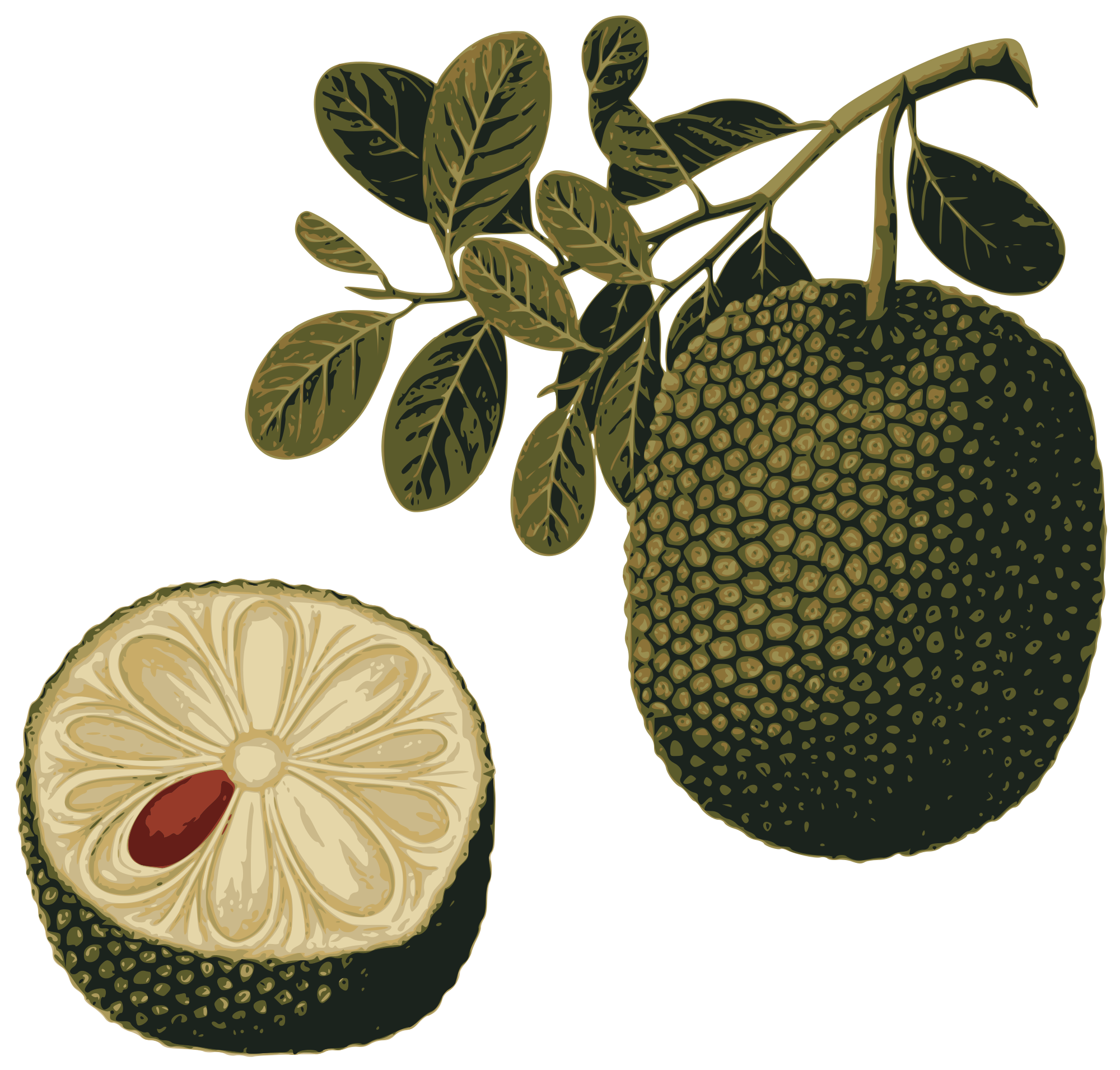 This is based on an old public domain book depiction of a jackfruit, both cut open and on a branch. Take a bite!