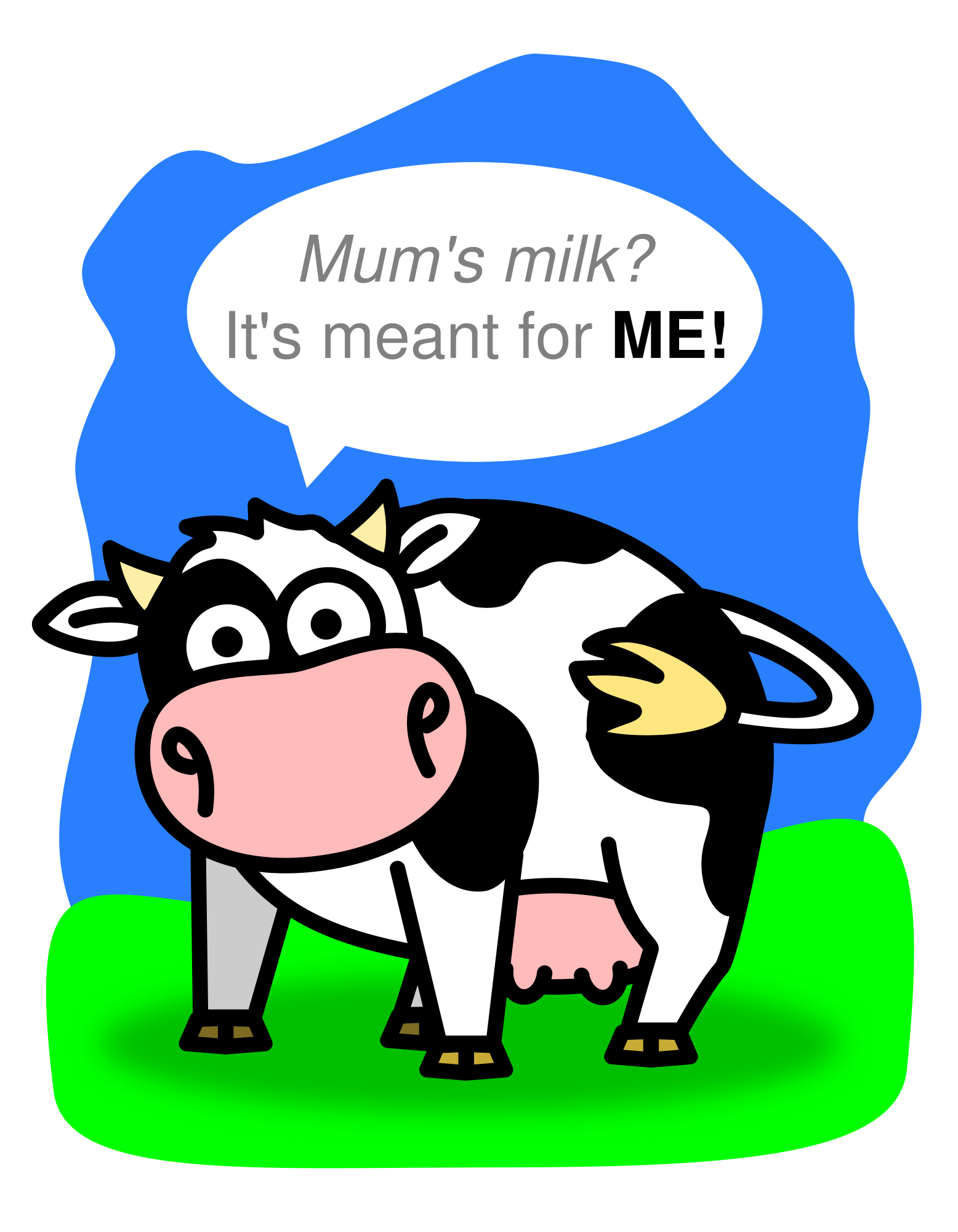 A calf in comic style saying: "Mum's milk? It's meant for ME!"