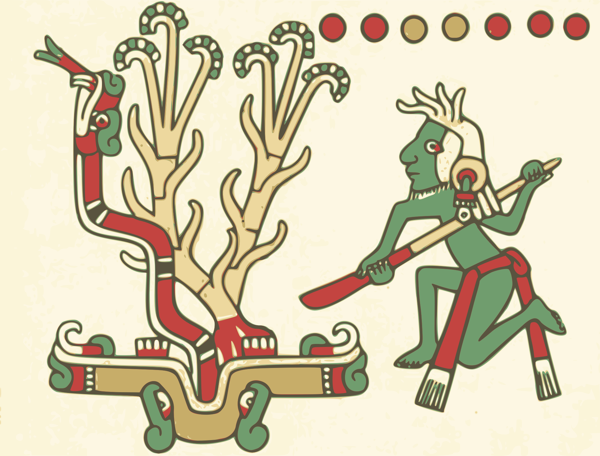 This is part of the Codex Fejérváry-Mayer. It looks like the one Aztec fighting or being friends with a snake.... That's not what is going on I guess maybe, but thats what it looks like!