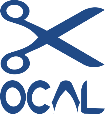 OCAL logo with the letters O C A L formed by diving the scissors logo in to shapes. The handle was used for O, C and A. The blades for the L.