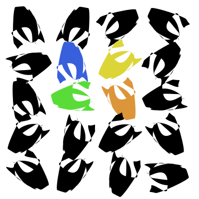 Black, yellow, orange, green and blue spots.