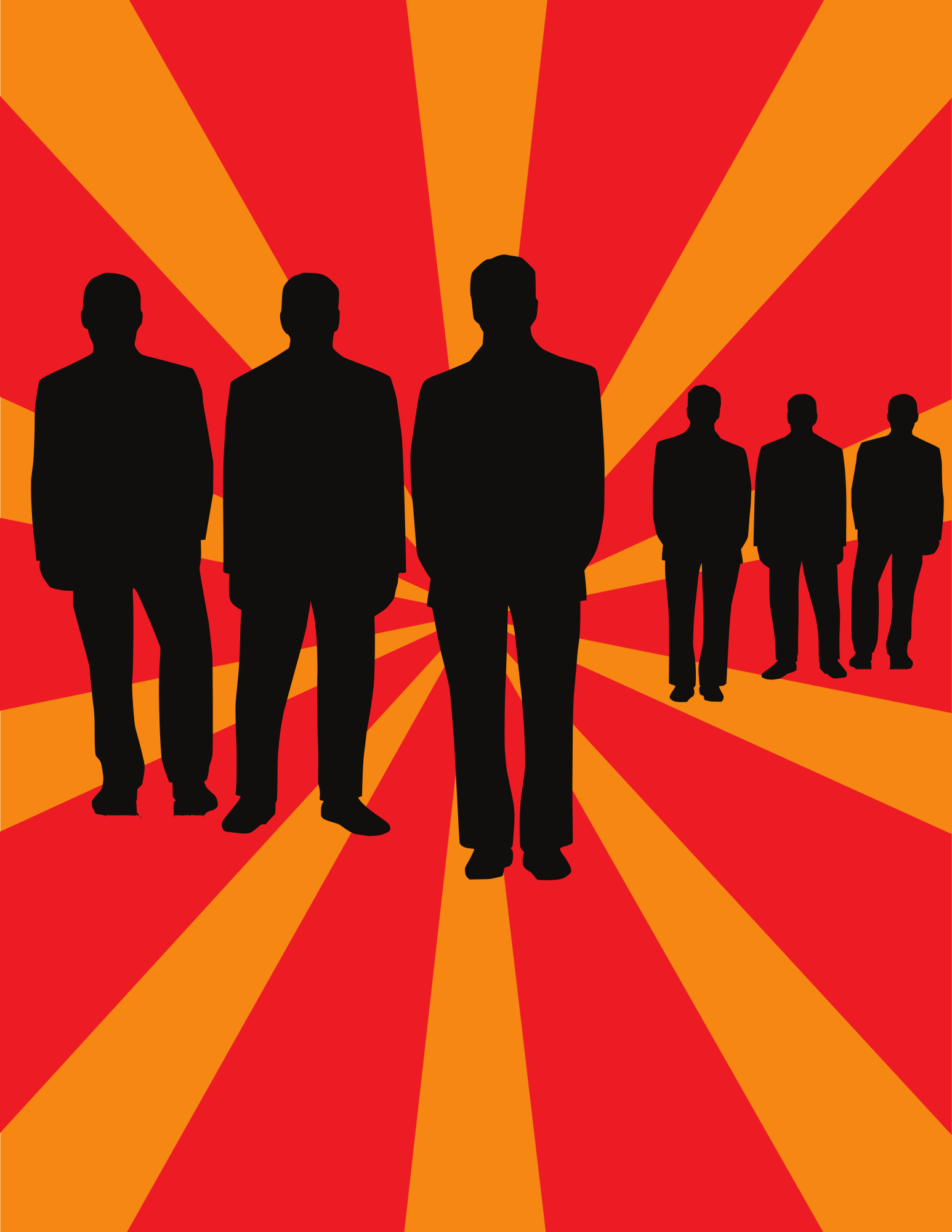 Vector silhouettes of business people with retro radial beams in the background.