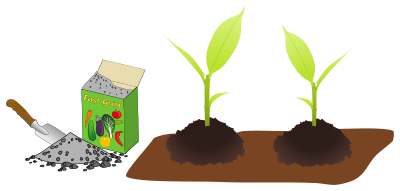 Box of horticultural (garden) fertilizer next to growing plants.