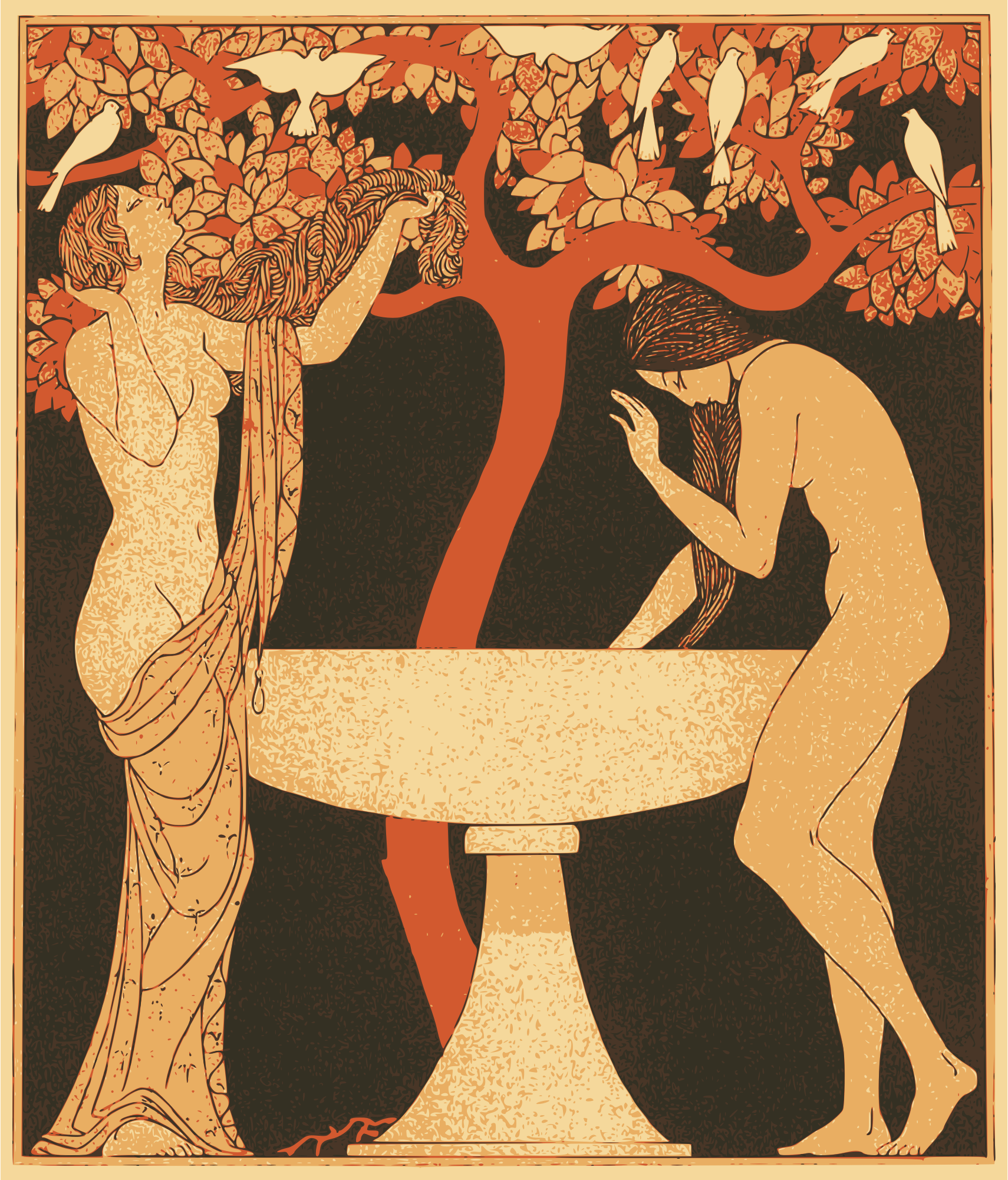 - art artistic bird classic female fountain girl girls Greek lady naked nude Roman Semi-Realistic People symbolic tree two woman women