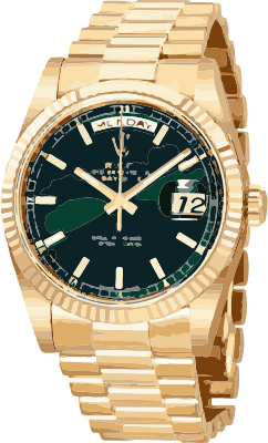 This is a very famous model of a gold and green swiss watch in a golden strap.