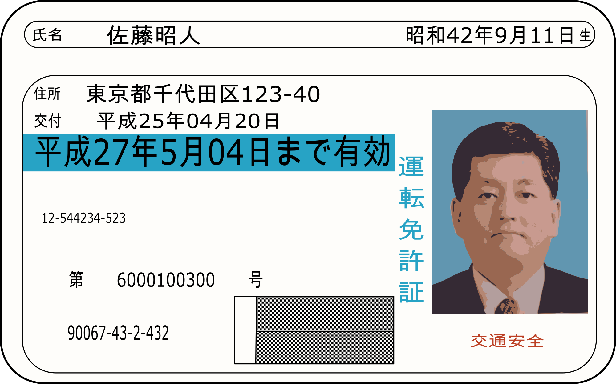 I know this isn't a 100 percent accurate! I intentionally changed some details and wording in order to make sure nobody would attempt to make a fake copy or something stupid like that. But this is roughly what a Japanese driver's license looks like,... and interestingly because of a rendering error the preview looks slightly different than the final one. (ID photo of the man based on a public domain image on Wikimedia.)