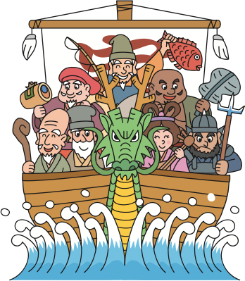 - Shichi Fukujin gods deity myth mythology deities Ebisu Daikokuten Bishamonten Benzaiten Fukurokuju Hotei Jurōjin Treasure Boat Takarabune dragon 七福神 lucky