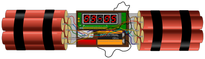 Improvised explosive device (IED) - e.g. amateur bomb created from dynamite sticks (cardboard cylinders), commonly used in the mining, quarrying, construction, and demolition industries. Put together with detonators and some homemade electronics with countdown clock.