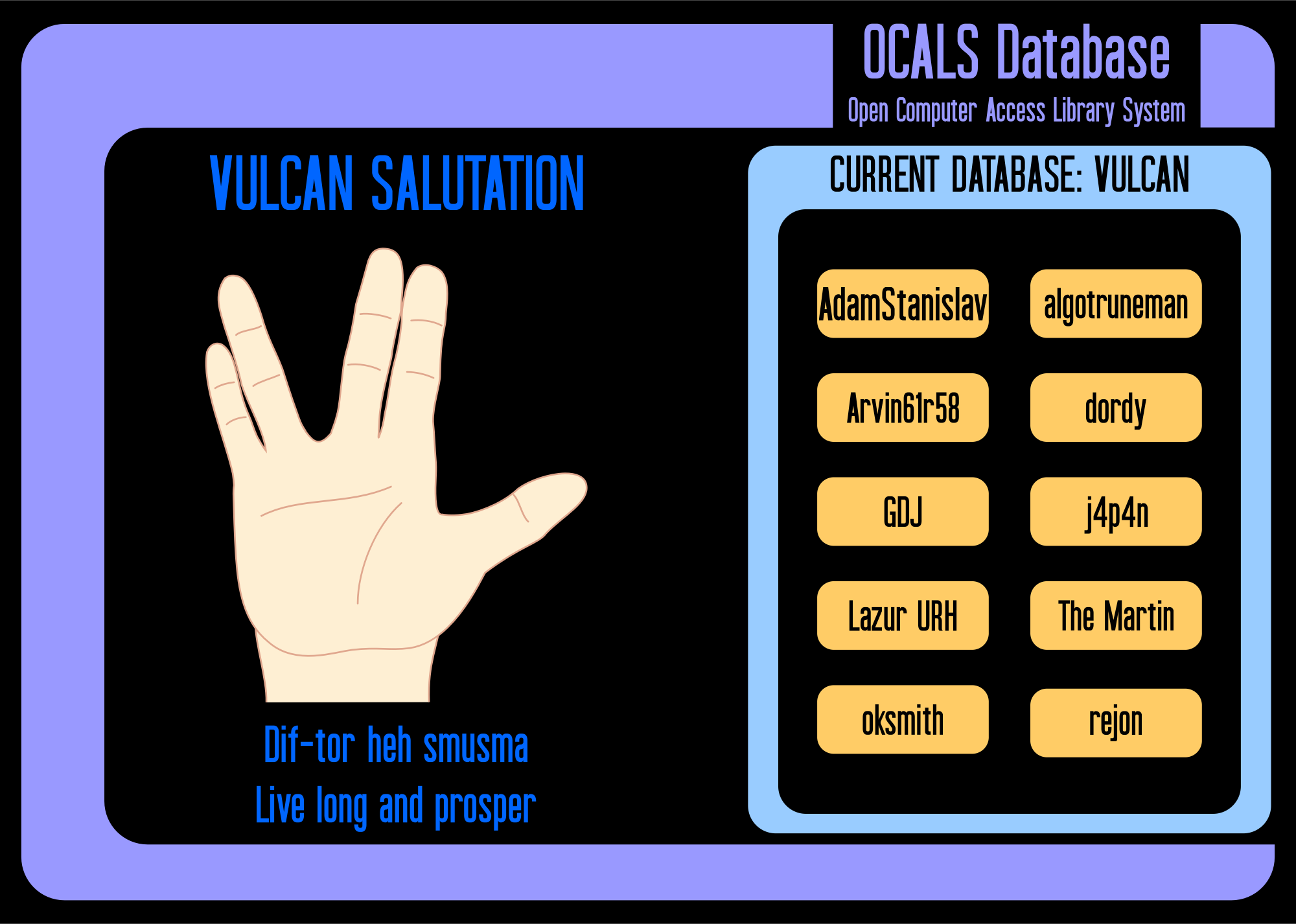 The Vulcan salutation or salute in a Star Trek LCARS (Library Computer Access & Retrieval System) style "interface". To avoid possible copyright issues, LCARS has been changed to OCALS (Open Computer Access Library System). An adaption of the acronym for a certain well known clipart library.